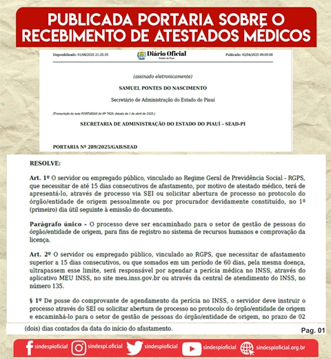 publica Portaria (Nº 289/2025) que disciplina o recebimento de atestados